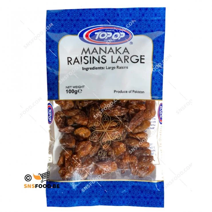 Topop Manaka raisins large /raisins /Ingredients: gros raisins secs. Allergy Advice: This product is packaged in a facility that processes nuts, sesame seeds, soy, mustard, celery and wheat. Energy/Energy 1394 kJ 333 kcal; fat/grass 0.5 g; of which saturated/not saturated 0.1 g; carbohydrates/glucides 79.0 g; of which sugars/dont les sucres 59.0 g; egg whites/protein 3.1 g; salt/sel 0.03 g. Store in a cool and dry place. Product of Pakistan. THT see packaging.